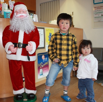 サンタクロースと記念写真 【KIDS 男の子と女の子】 2009.12.03 先月前歯をぶつけた蒼大くん 今日は、お顔の傷もきれいに治っていました 今日の付添には、妹のあおいちゃんも来てくれました。 1歳5カ月だって 一緒に はいポーズ