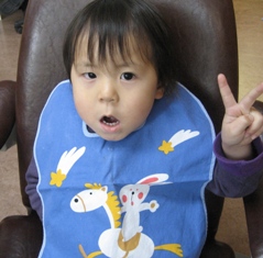 カメラを向けると、ちょっと恥ずかしそう。むし歯の治療をがんばりました。立派