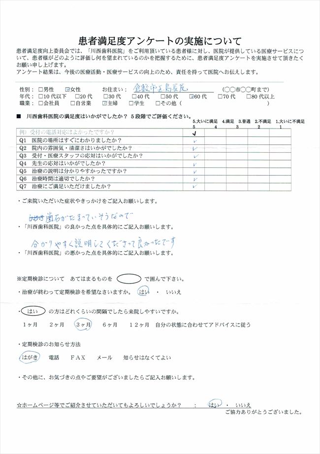 歯石がたまっていそうとご来院された患者様 2014.12.06 性別:女性 お住まい:倉敷市玉島長尾 年代:60代 職業:主婦 ■ご来院いただいた症状やきっかけをご記入お願いします。 歯石がたまっていそうなので ■「川西歯科医院」の良かった点を具体的にご記入お願いします。 分かりやすく説明してくださって良かったです。 ※定期健診について ■治療が終わっても定期健診を希望なさいますか。 はい ■「はい」の方はどれくらいの間隔でしたら来院しやすいですか。 3か月 ■定期健診のお知らせ方法 はがき