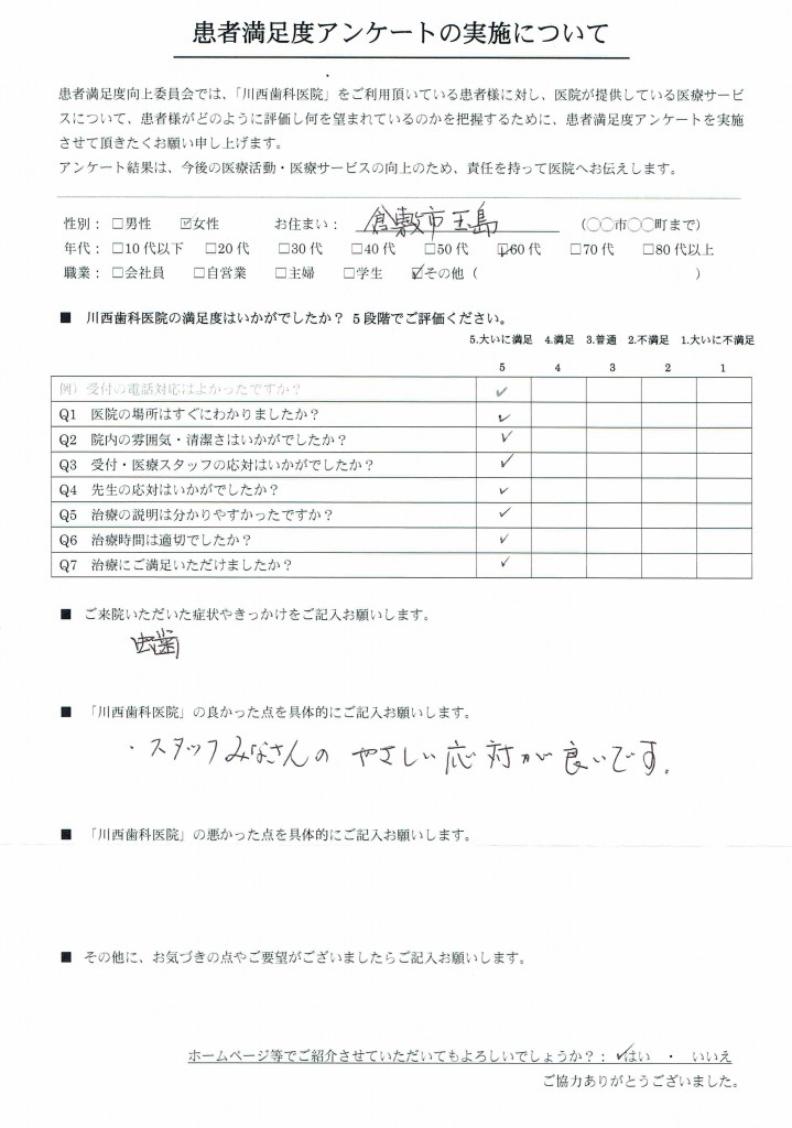 性別:女性 お住まい:倉敷市玉島 年代:60代 職業:その他 ■ご来院いただいた症状やきっかけをご記入お願いします。 虫歯 ■「川西歯科医院」の良かった点を具...