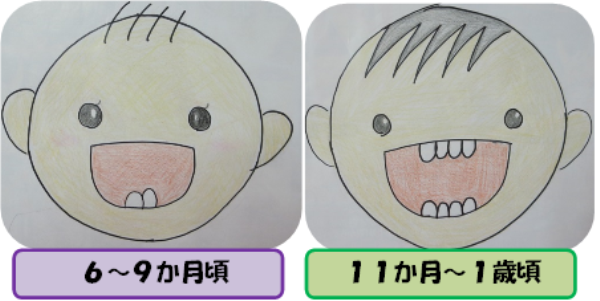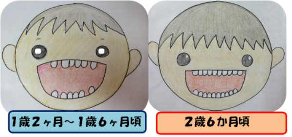 【2歳の子どもと歯医者 5】乳歯の標準的な生え方 2015.10.27 皆さんこんにちは。川西歯科医院の歯科衛生士の定廣です。 今回は標準的な乳歯の生え方についてお話します。 生後6~9ヶ月頃:下の前歯が生えてくる 生後9~10ヶ月頃:上の前歯が生えてくる 生後11ヶ月~1歳頃:上下の歯が4本ずつに 1歳2ヶ月~1歳6ヶ月頃:奥歯(第一乳臼歯)が生える 1歳9ヶ月~2歳頃:犬歯が生える 2歳6ヶ月頃:奥歯(第二乳臼歯)が生える 3歳頃:乳歯の完成です! 乳歯は全部で20本。通常は上のような順番で生えていきますが、前後することもあります。すべての乳歯が生えそろう時期は2歳半が平均的です。